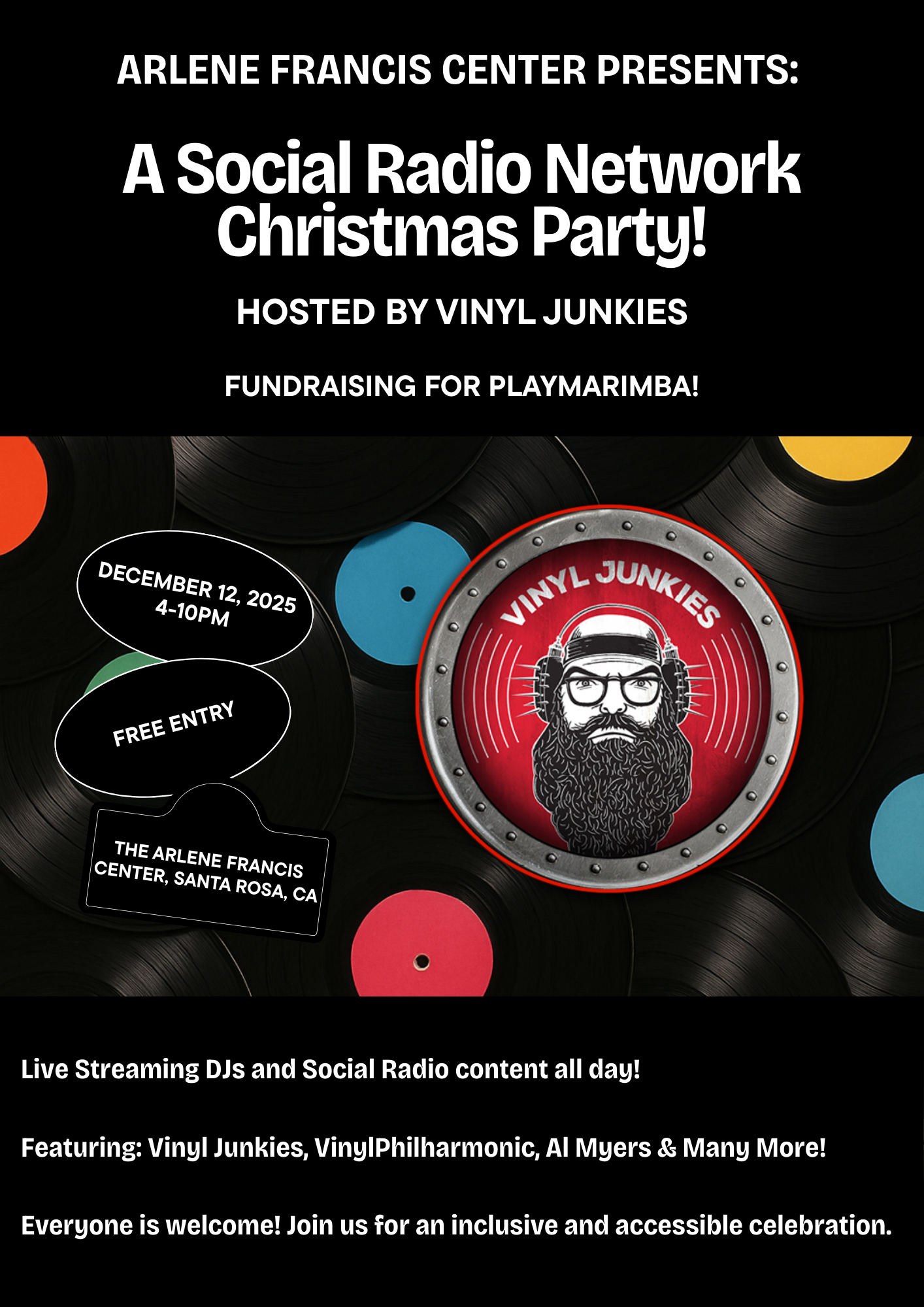A Social Radio Network Christmas Party! HOSTED BY VINYL JUNKIES FUNDRAISING FOR PLAYMARIMBA! DECEMBER 12, 2025 4-10PM FREE ENTRY THE ARLENE FRANCIS CENTER, SANTA ROSA, CA Live Streaming DJs and Social Radio content all day! Featuring: Vinyl Junkies, VinylPhilharmonic, Al Myers & Many More! Everyone is welcome! Join us for an inclusive and accessible celebration.