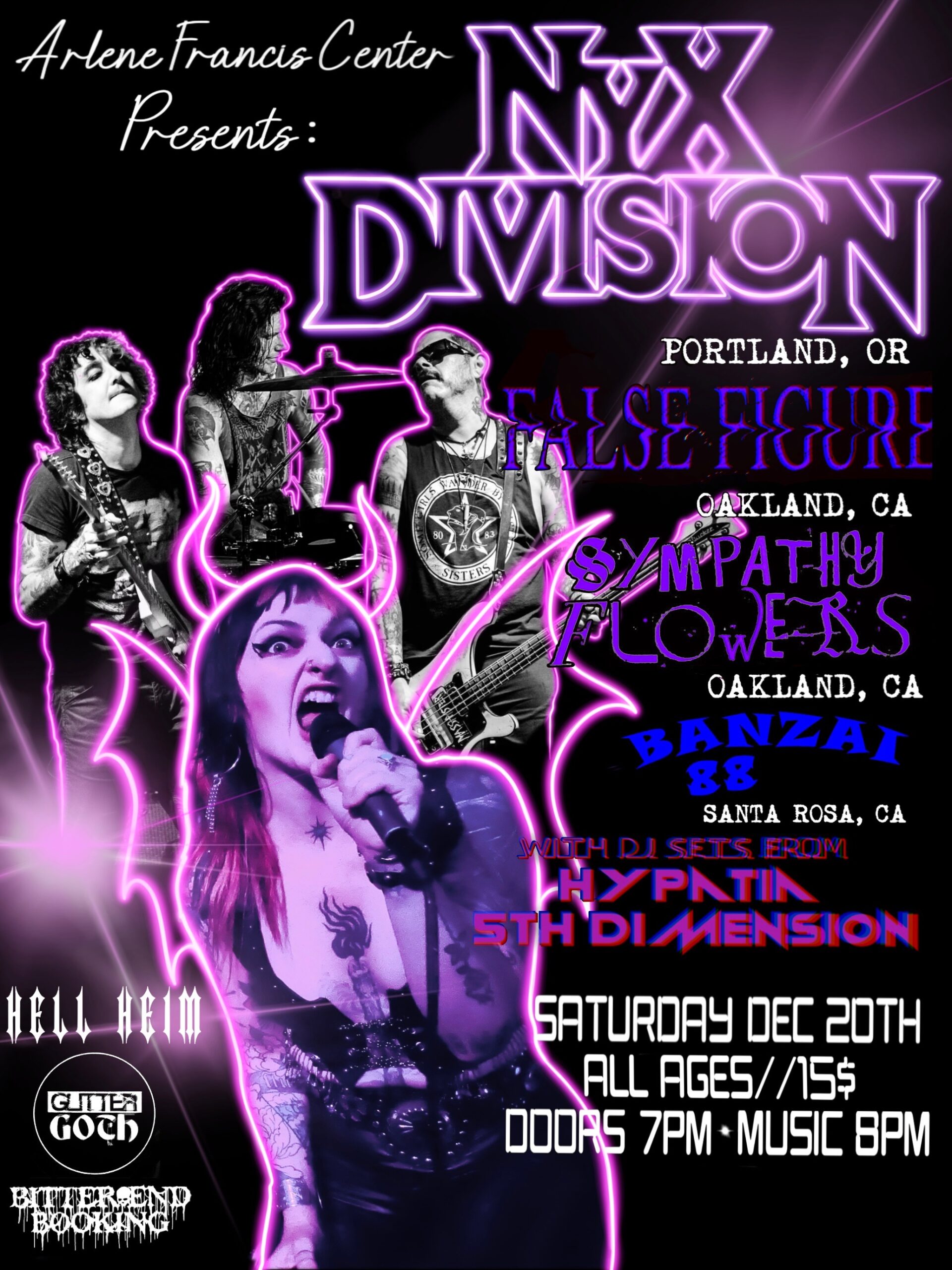 With False Figure (Oakland), Sympathy Flowers (Oakland), and Banzai 88 (Santa Rosa) Glitter/Goth, He’ll Heim and Bitter End all come together for a night of Live Music and it’s some really amazing bands! NYX Division is coming Down from Portland OR and playing at the Arlene Francis Cwnter on December 20th with Santa Rosa’s Banzai