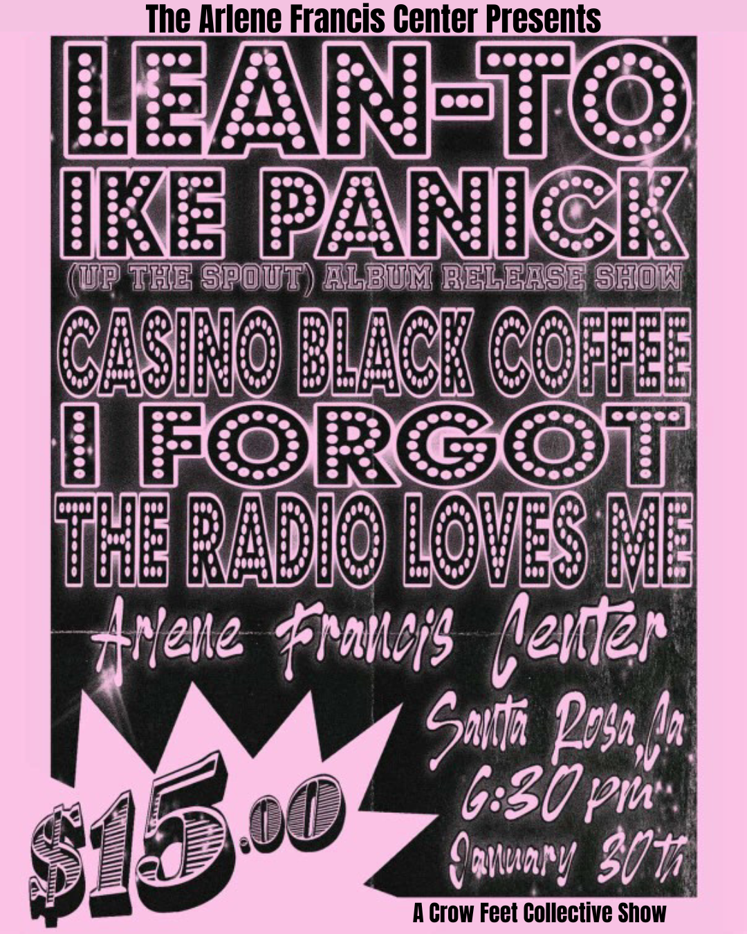 Record Release Ike Panick record release with a great line up: Lean-to Casino Black Voffee I Forgot The Radio Loves Me January 30th Doors at 6:30 $15