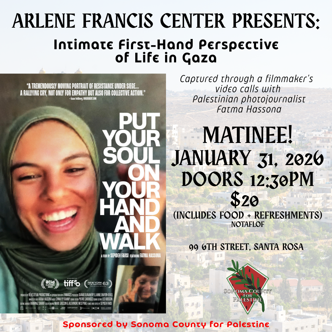 Intimate First-Hand Perspective of Life in Gaza Captured through a filmmaker’s video calls with Palestinian photojournalist Farma Hassona MATINEE! JANUARY 31, 2026 DOORS 12:30PM $20 (INCLUDES FOOD + REFRESHMENTS) NOTAFLOF 99 6TH STREET, SANTA ROSA
