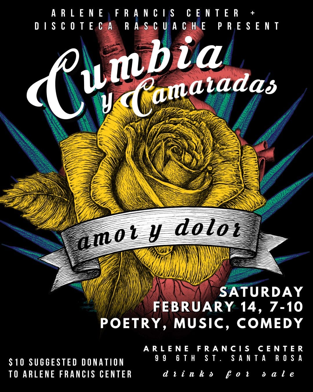 Amor y dolor Cumbia y Camaradas – “Amor y Dolor” on Feb 14th! The world is heavy right now, fascism is trying to flood our bodies, minds and spirits, but we’ve got the antidote within our own mutual care and tenderness. It’ll be a fun and funky evening, different performers, participatory art, and good humans