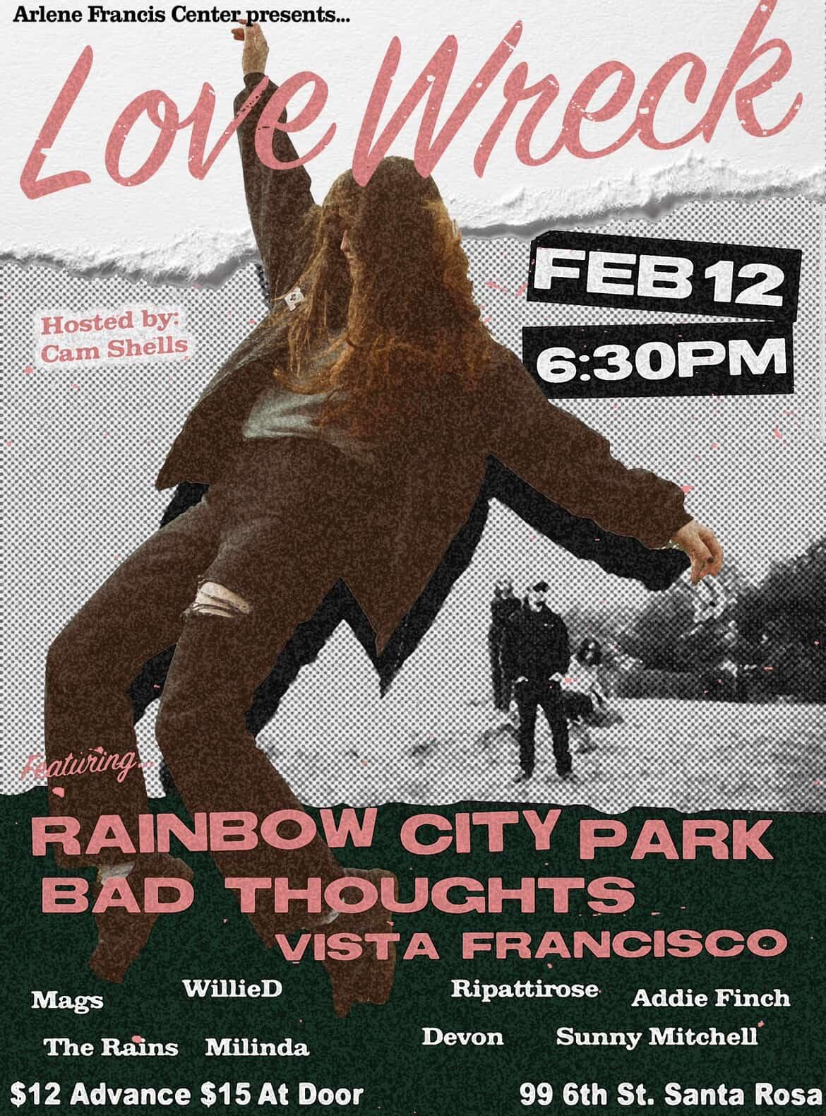 Rainbow City Park, Bad Thoughts and Vista Francisco We are very PUMPED for this line up! You won’t want to miss this show. 3 Bands With a ton of extras in between. February 12th doors at 6:30