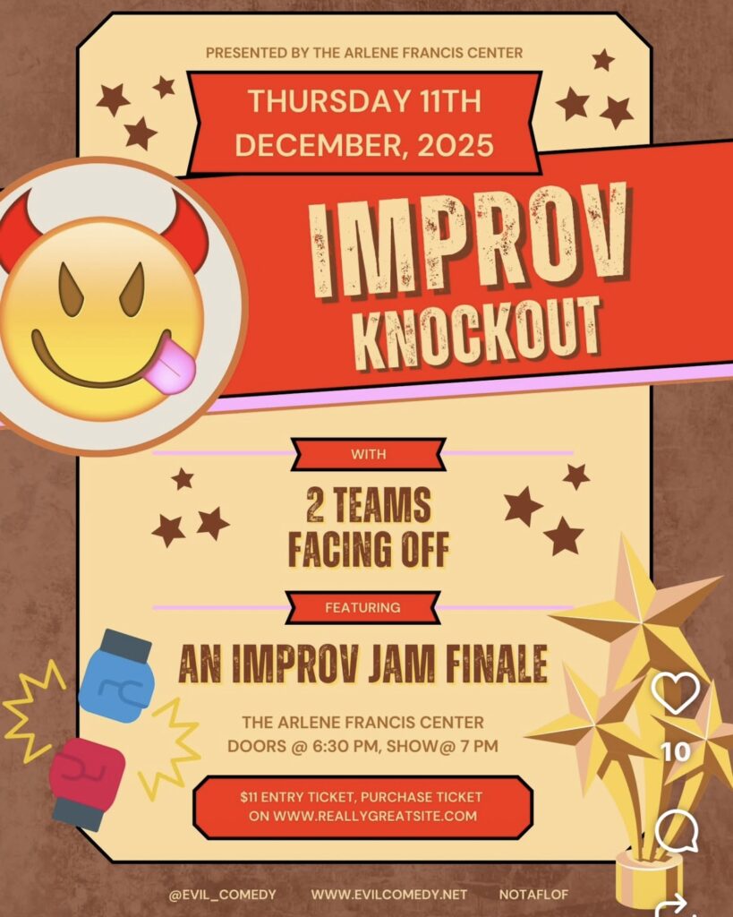 This Tursday, get ready for a comedy battle for the ages. Two improv teams will take the stage and duke it out to claim the Improv KnockOut Title! And the winner is chosen by none other than you, the audience.