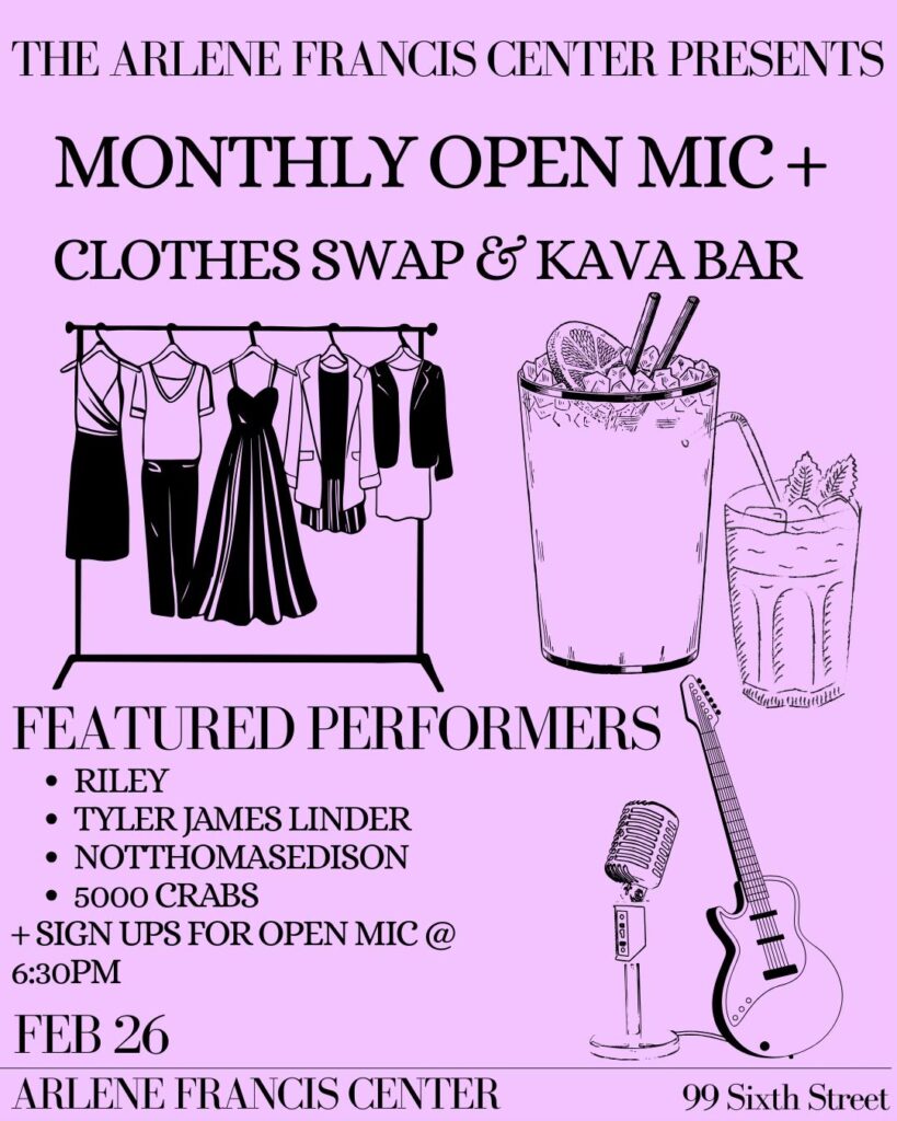 AFC presents our monthly open mic featuring a kava bar and clothing swap! This event is open to all ages and performers. The featured performers are as follows with open mic slots available for sign up at 6:30!