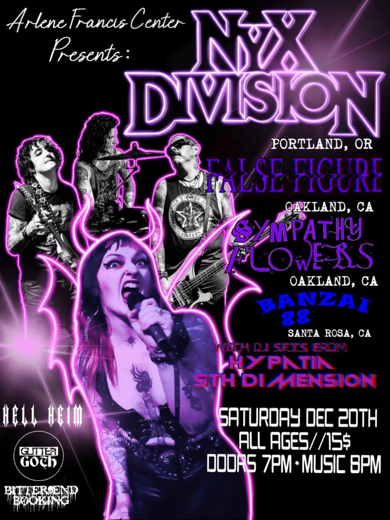 Glitter/Goth, He’ll Heim and Bitter End all come together for a night of Live Music and it’s some really amazing bands! NYX Division is coming Down from Portland OR and playing at the Arlene Francis Cwnter on December 20th with Santa Rosa’s Banzai 88 and coming up from Oakland we’ll have Galse Figure and Sympathy Flowers. You won’t want to miss this show!