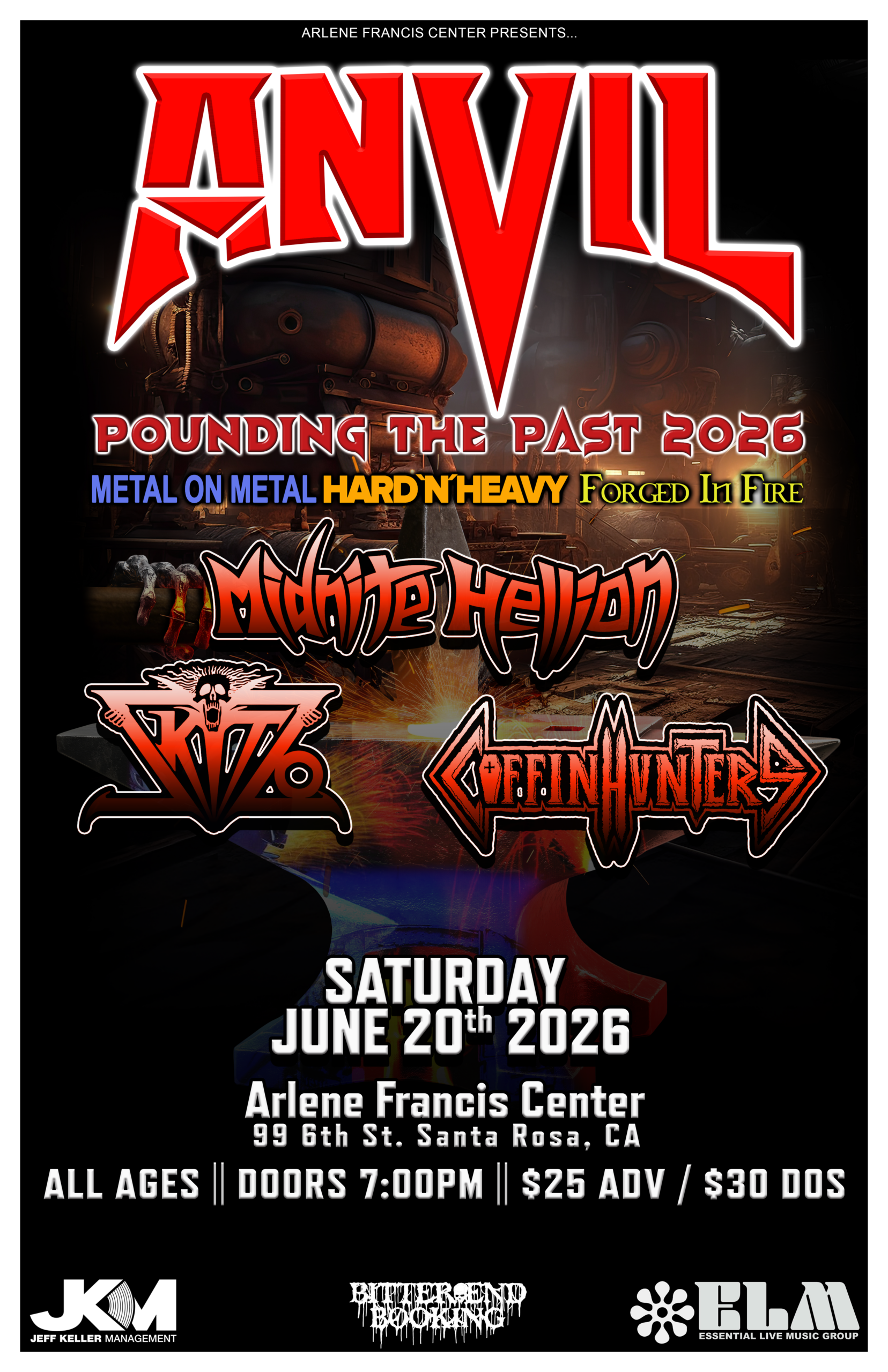Metal on Metal, Hard ‘n Heavy… Forged in Fire! Come out for the epic night with Anvil, Midnight Hellion, Coffin Hunters and Skitzo. $25 in advance $30 at the door. Show starts at 7pm